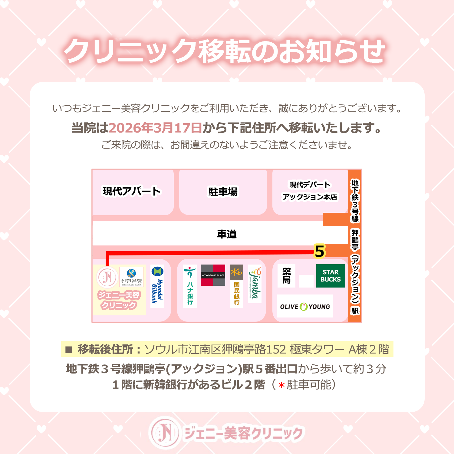 🚇 地下鉄3号線 狎鴎亭(アックジョン)駅 5番出口より徒歩約3分